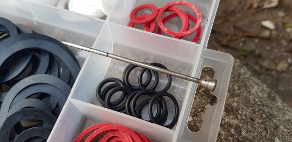 Nekiállhattam volna valahonnan parafatömböt szerezni, furkálni, vagdalni, de volt a Miki által adott készletben egy klasszikus, fix füles, elforgatós típusú, háború utáni, másféle csap is. Ahhoz gyártottam olló, lyukasztó és gumilap segítségével új tömítőbetétet, kipucoltam az egészet, s előállt a jó csap. Valahol muszáj engedni, s inkább én tegyem azt az eredetiségből, mint a csap a benzinnel. Ez is kis tétel, és ahogy a neten levő más NSU 251 OSL-eket nézem, azokon is többnyire már ilyen csap van.
