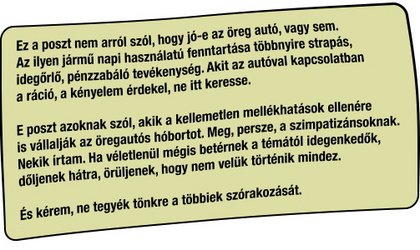 Én viszont tetkó nélküli, gyatra izmú, kokszolatlan, konditermet még csak kívülről látott CsZs/4B vagyok, akinek nincs acélos marka, csak a maró, etanolos benzintől sebes irodista keze, nekem semmi nem megy azonnalra, akárcsak a hozzám hasonló, valódi villáskulcsot szorongató, több tízezernyi, ködös tekintetű veteránosnak. Nálam ilyenkor csak néhány ernyedt szuszogás hagyja el a nyolcvan éves tüdőt, igazi életjel minden reménye nélkül. Aztán még szuszogás, még szuszogás, még... szorozzátok meg vagy százzal.