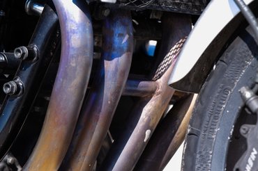 A fényezés 18 év elteltével is csodás, ősi templomok mélyéről előkerült kincsként ragyog, ha rásüt a nap, az pedig már csak az én különvéleményem, hogy a gyári színek közül ez az ezüst-sötétkék-világoskék kombó a legszebb. Már most egyfajta patina borítja, az egészet pedig megkoronázza az Asahina Racing kipufogórendszer a két végdobbal. Ezzel kerek, így válik műalkotássá. Zseniálissá teszi a hátsó nézetet a két terpesztő kémény a 190-es hátsó gumival. A 4-1-2 elrendezésű rendszer minden szempontból lenyűgöző, ahol a két dob szétágazik, már hatvanas csövek vannak, a dobok vége pedig már 70 mm átmérőjű, nem is láttam még ilyet. Az egész kidolgozása szédítő, a csodás hegesztésekkel - el is kérik az árát, félmillió körül mozog újonan.