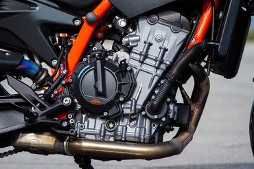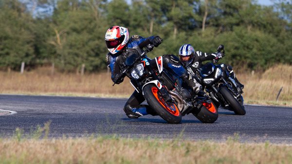 Mindkét motorkonstrukciónak megvannak az előnyei, azonban a KTM sokkal fejlettebb elektronikai csomagja még élvezetesebbé teszi a játékot. A hattengelyes IMU-val operáló dőlésszög-érzékeny kipörgésgátlót ugyanis teljesen el lehet szeparálni az egykerék-kontrolltól. Ez kanyarból kifelé sokkal szebben szabályoz a Triumph egyszerű elektronikájánál, ráadásul a bal kormánykapcsolóról menet közben is állítható az érzékenysége. Tehát folyamatosan távol tudja tartani a highside-esés ördögét, miközben bármikor végig tudod lógatni a célegyenest. A blokkolásgátló supermoto módjának és a szintén konfigurálható motorféknek köszönhetően pedig a keresztbe csúszós féktávoknak sincs a rutinon és a bátorságon kívül semmi akadálya. Hát nem csodálatos?
