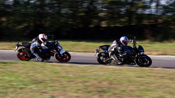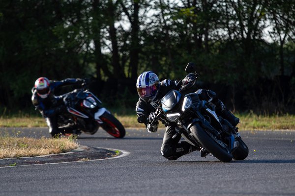 Kakucson és az Euroringen elképesztően élvezetes a Duke R-rel csapatni, de például a Hungaroringen vagy a Pannóniaringen biztosan a Street Triple kerülne előnybe. A Triumph-on alacsonyabb és keskenyebb a kormány, közvetlenebb a kapcsolat az első kerékkel. Ezáltal némileg előrébb dől a felsőtest, elviselhetőbb rajta az autópályázás. A választás tehát inkább ízlés, motorozási stílus kérdése. Van, akinek a simulékony sorhármas visítása és pörgős karaktere jön be, míg másnak a huligán kéthengeres dübörgése és telt középtartománya.
