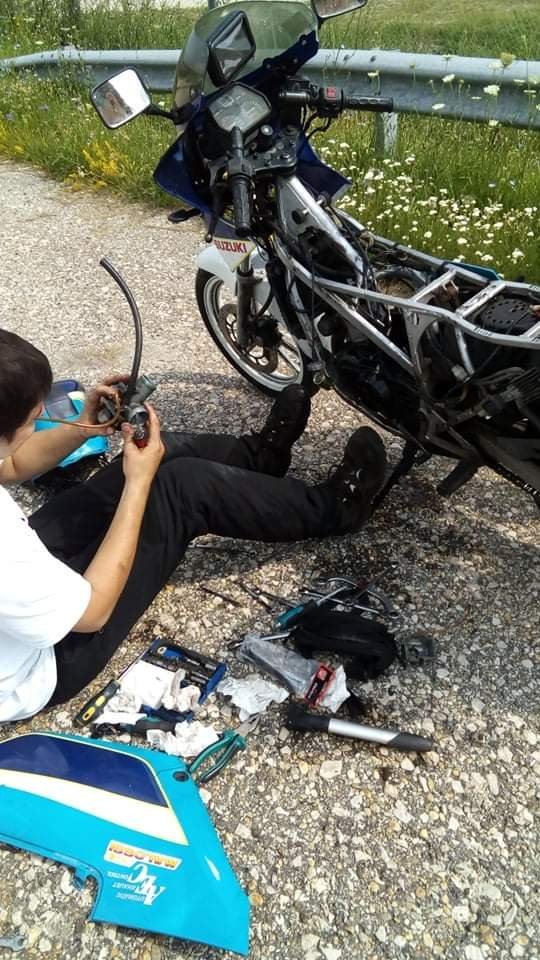 Nekiálltam kivenni a karbit, szerencsére minden szerszám nálam volt ehhez. Időközben Peti is utólért minket, észrevett és félreállt segíteni. Elmondtam neki a sztorit, és ő úgy vélte, megszorult a motor, nem karbi gond lesz. Azért csak kivettem a karbit, de Petinek lett igaza, mert az patyolat tiszta volt. Így egy jó adag 2T olajat löttyintettem a benzinhez és tolásra kínkeservesen beindítottuk a motort, ami végül működött, de nagyon nagyon füstölt.