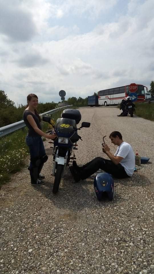 Ekkor egy rendőrautó állt meg mögöttünk és szóltak, hogy száz-kétszáz méterre ha előrébb tolom a motort, van egy szervíz út, ahol biztonságosabban szerelhetem a vackomat. Amíg toltam, mögöttem gurultak a leállósávban és ők hozták Krisztit a rendőrautóval, nagyon rendesek voltak.
