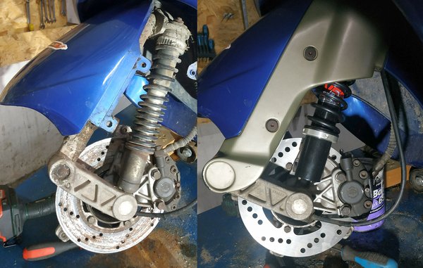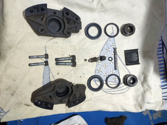 Már a Quartz vásárlásakor feltűnt, hogy mennyire rossz az első fék. Nem a fékerő hiányzott, az még stimmelt, de utána befogott, ezért volt az, hogy lassítás után gázadásra az eleje ült össze, nem a hátulja. Emiatt készültem felújítókészlettel - a fékdugattyú átmérője alapján választottam ki, természetesen azt leszámítva nem stimmelt semmi, de szerencsére a nyereg nem csak hogy vészes nem volt, kimondottan tiszta és jó állapotban találtuk, még a porvédőt is simán újra lehetett hasznosítani.