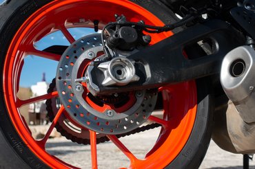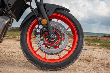Az első féktárcsák nagyobbak lettek, 282 mm-es helyett már 298 mm átmérőjűek, és elsőre jelentéktelen apróságnak tűnik, a valóságban igenis fontos újítás, hogy 2021-től a Michelin Road 5 a gyári szerelés - a jó gumi a legfontosabb, hiszen minden azon keresztül történik, a gyorsítás, a lassítás, a kanyarodás. Ha a gumi rossz, minden rossz lesz, és az előző modell Battlax BT023-as papucsai nem voltak jók, annak a nemzetközi bemutatóján össze-vissza csúszkáltunk, néhol tényleg necces módon, de a száraz Kakucson sem éreztem azt, hogy végig partner lenne az MT alapos kimotorozásában. Ezek a kétkomponensű Michelinek már jók, de továbbra is fenntartom, hogy erre a motorra egy ragadós sportgumi sem túlzás.