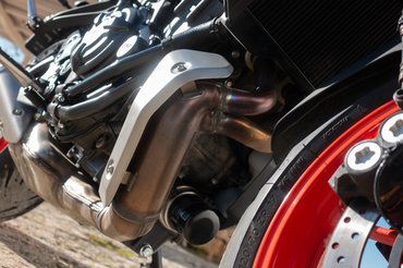 Minden más az emisszióról szól, az új szívócsatornák, az új injektor, az ECU és a látványosan másmilyen kipufogó. A katalizátor a blokk alól felköltözött egészen közel a hengerfejhez - nagyjából ott kezdődik, ahol az előző generációk feláras Akrapovic titán rendszerében a közösítőcső volt. Azáltal, hogy a katalizátor ennyire közel került a kipufogószelepekhez, gyorsabban bemelegszik és magasabb hőfokon üzemel, így egyfelől hatékonyabb, másrészt kevesebb nemesfém kell hozzá, ezáltal olcsóbb is. A motorost leszámítva mindenki nyer, ugyanis a kifutó modellhez képest a -1 lóerő és a +1 kiló is az új kipufogó számlájára írható.