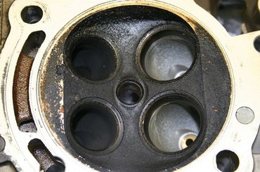 Már félve vettem elő az intót a henger méréséhez, de szerencsémre szinte mérhetetlen a kopás, bármelyik pontját vizsgálom. Ha már ennyire felaprítottam, és mindent kitakarítottam, természetesen a hengerfej sem maradhat ki a jóságból. Az égéstér persze csupa koromlerakódás. Szelepeket becsiszolom, de a szelepszárak gyári értéken vannak, és a lógása is jóval határértéken belüli. Aki nem ismeri ennek a vezérlését, annak elmesélem a működését: a főtengely egy láncon keresztül forgat egy kiegyenlítőtengelyt, a kiegyenlítőtengely oldalanként egy-egy lánccal forgatja a vezérműtengelyeket, a vezérműtengely nyomogatja a csészéket, a csészék nyomogatják a nyomórudacskákat, a nyomórudacskák nyomogatják a himbákat, azok meg a szelepeket. Egyszerű nem?