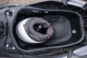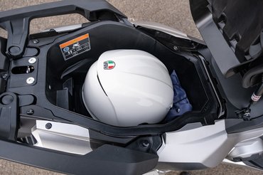 Ebből származik az összes sportrobogó közös nyűge, hogy alig van raktér az ülés alatt, hiszen a blokk és a futómű mind-mind onnan vesznek el. Míg egy klasszikus díványrobogó ülése alá befér két sisak, ezeknél csak egy, és azt is alaposan át kell gondolnod, hogyan forgatod be. Egy Piaggio X8 ülése alá egy teniszütő befér, a Forzába a hátizsákomat sem tudtam bepréselni. A BMW erre találta ki a flexcase-t, hogy legalább míg parkolsz, legyen hova rakni a cuccaid.