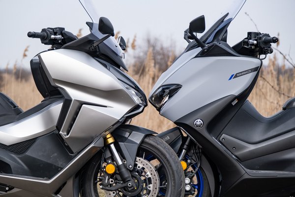 Blokk terén nálam egyértelműen a Forza nyert, a dübörgő kéthengerese lentről lép, nyomatékból ugrik, röfögve gyorsít, valódi váltófokozatokkal rendelkezik, és izgalmasabb karaktere van. Sportmódban szépen kiforog, standarban hamar felvált, és rotyogva siklik, de ki lehet rakni manuálba, vagy van személyre szabható mód, melyben külön lehet állítani az erőleadást, a kipörgésgátló érzékenységét és a váltó viselkedését - nekem a sport és a standard bőven elég volt mindenre. A TMAX-nál az üzemmódkapcsoló nem hoz olyan markáns változást, de folyamatosan magas fordulatszámon forgott, és nem kísérte az a kellemes dübörgés. A CVT egyszerűen unalmasabb, mint a DCT. A Yamaha elvileg belenyal a 180 km/h-ba, a Forza végsebessége pedig valahol 170 körül alakul, tehát aki erre gerjed, annak a TMAX az igaz út, de a Forza egyszerűen stabilabb, és jobb érzés vele tempót menni.