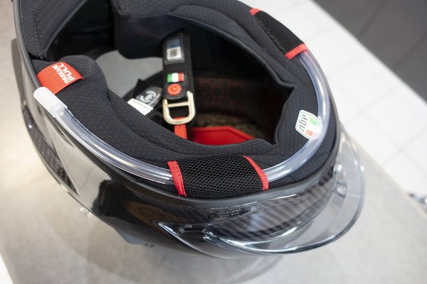 A plexije kimondottan vastag, az átlagos 1 mm helyett 5 mm, állítólag azért, mert zárt állapotban ez is hozzájárul a sisak szerkezeti merevségéhez. És ez is exkluzív, semelyik másik modellel nem kompatibilis - a korábbi utcai változat Corsa R-rel igen, de olyat már csak elfekvő készletből lehet venni. A sisakzsák is igényesebb, mint a többi AGV-é, de régen ennek jobban megadták a módját. A K6-hoz amúgy olyan hitvány és kellemetlen tapintású batyut adtak, hogy amikor az MT-09 tesztre repültem, inkább egy régi Arai zsákjában vittem.