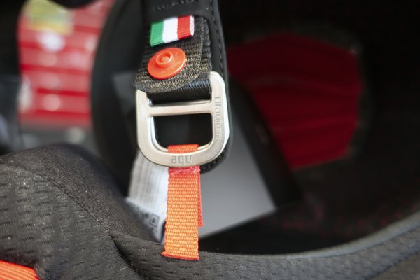 A D-gyűrűk titánból vannak, és nem véletlenül voltak ismerősek, ugyanilyenek voltak a három éve bemutatott AGV Sportmodularon is. Hiába csúcsmodell, azért nem lehet minden patent egyedi, a végén még elszállna az ára! Az AGV régi barátságot ápol a drága fémekkel, korábban is volt titán légbeömlőjük, hiszen mi mással lehetne hangsúlyozni a luxust és a technológiai fölényt? Csajozni mondjuk nehezen lehetett vele, mert hiába volt titán, simán a leggagyibb műanyagnak nézett ki, de ugye a tudat!