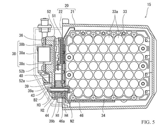 A mostani szabadalom az akkumulátorról szól, és kijelenthetjük, hogy jelenleg minden az akkuk körül forog, mert míg egy villanymotor könnyebb, hatékonyabb és olcsóbb, mint egy belsőégésű, addig az akkumulátorok egyelőre nehezebbek, nagyobbak és drágábbak, mint egy tank benzin. A Kawasaki egy cserélhető akkupakkban gondolkodik, és éppen a kiegészítő hajtásban vállalt szerepe miatt megengedhető, hogy kicsi és könnyű legyen - bőven elég, ha fél-egy órányi hajtáshoz elég csak, a többire ott van a benzinmotor.
