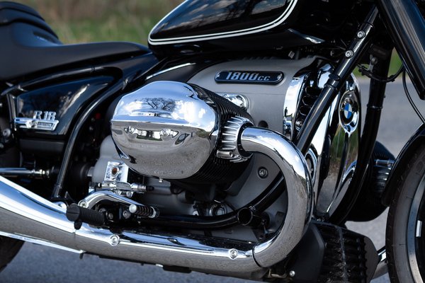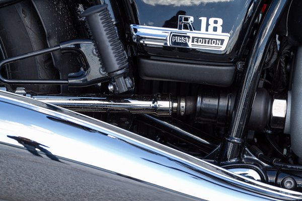 A motor oldalnézete teszi egyértelművé, hogy az R 18 inkább hosszú és nyúlánk, egyedül a blokk tömbszerű, de maga a váz egészen karcsú és lapos. Nem is értem, mi nyom ezen 350 kilót, mert végigkopogtatva azért van bőven fém, de a műanyagok után sem kell sokat kutatni. Ennél a tömegnél már indokolt a hátrameneti fokozat, a blokk bal oldalán van egy kallantyú, azt felhúzva járó motornál az önindítót nyomva szépen elindul hátrafelé. Ennél még elvagy nélküle, de a készülő, gigantikus túraváltozatokhoz elengedhetetlen lesz.