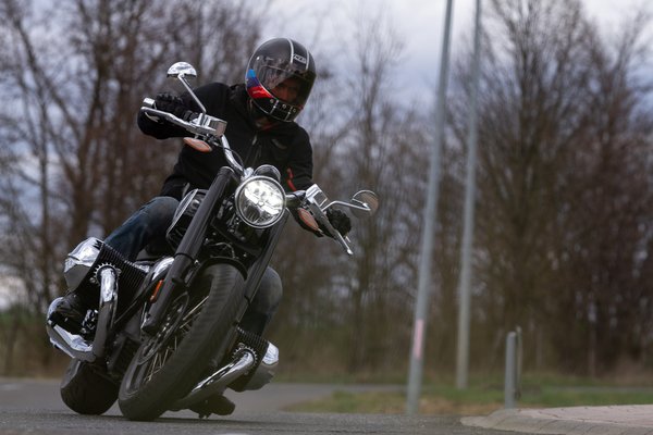Az üléspozíció egyébként meglepően túramotoros, de az oldalra kiálló hengerek miatt nem nagyon volt más választásuk, ennél csak hátrébb lehet tenni a lábtartót. Szerintem egy cruiseren éppen a laza fetrengés a legjobb, de ennek is megvan a maga előnye, így sokkal hatékonyabban lehet irányítani, városban például egyáltalán nem megterhelő vele a sorok közti lavírozás, mondom, igazából nem a Harley Fat Boy-nak alternatívája, hanem a Yamaha TMAX-nak. Csak aztán ott van a fránya 25 fok, aminél lejjebb nem hajol.