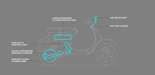 A londoni Retrospective Scooters elektromos átalakítókészletet kínál régi Vespákhoz és Lambrettákhoz. Elsőre szentségtörésnek tűnhet, de a sok foglalkozást és szaktudást igénylő régi, benzines technikát váltanák ki modern megoldásokkal, ráadásul úgy, hogy a külsőt érintetlenül hagyják. A Project E-nek keresztelt villanyosító kit tartalmazza a kefe nélküli egyenáramú motort, a motorvezérlőt és Samsung lítium-ion akkukat, az akkutartót, az akku töltésvezérlőjét, az egyedi lengővillát, a ledes világítást és az összes szükséges kábelt és vezetéket.