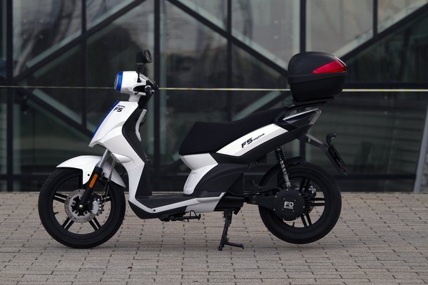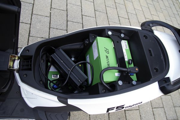 Hogy az F5-ben pontosan mennyi cella van, az nem derül ki - a két akkupakk egy-egy zárt dobozban kapott helyet, melyek egyébként szerszám nélkül könnyen kivehetők, és amennyiben van kedved cipelni a kétszer 11 kilót, a lakásban is tölthetők, nulláról kb. 4 óra kell nekik a gyári 10 amperes töltővel. Végignézve a robogón, mindenhol szabvány robogóalkatrészek köszönnek vissza, semmi villantós extra, még a lámpa sem ledes, sőt, az akkupakkok háza is egy szimpla doboz - ez ebben az esetben előny, ugyanis így könnyen bontható és szerelhető, ami egyrészt egy cellazárlat elhárítását is olcsóvá és egyszerűvé teszi, másrészt nyitva van a lehetőség, hogy ha kijönnek a fejlettebb, magasabb energiasűrűségű cellák, könnyen átépíthető lesz, akár házilag is.