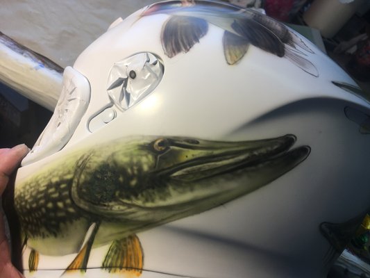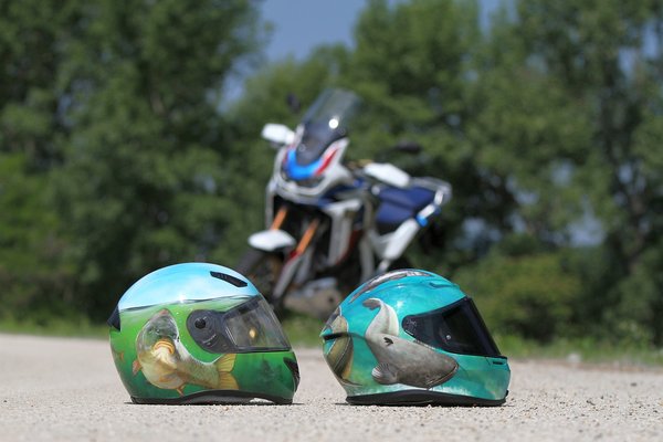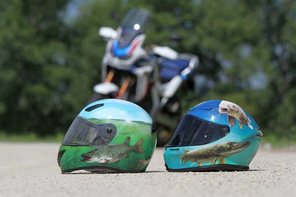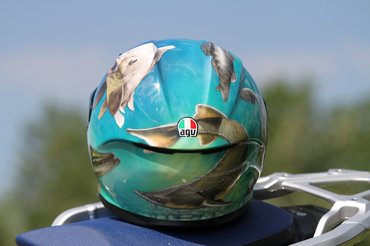 Volt már egyedi fényezésű sisakom, de az már pár éve visszavonult a polcra. Elhasználtam, nincs tovább, műtárgy lett belőle. Azóta is folyamatosan vágytam arra, hogy újra halas sisakban motorozzak - így az AGV K6-tal amint lehetett, bekopogtattam Mike Tomihoz, a hazai airbrush pápához. Annyit mondtam, hogy a halak hiányoznak, átküldtem neki képeket a kedvenc fajaimról, a többit pedig rábíztam, elvégre kettőnk közül ő a művész. Március elején adtam le a bukót - Tomi elfoglalt volt, akkor indult éppen a rali szezon, ahol a fél mezőnynek ő festi a sisakokat, meg igazából mindenkinek, beleértve Michelisz Norbit is, nem is nagyon zaklattam, hagytam alkotni. Nagyjából egy hónap múlva hívott, hogy mehetek a műért. Az előzőt is imádtam, ez a mostani pedig egyszerűen szürreálisan jó lett. A régi olyan mellette, mint amikor rácsodálkozol egy régi számítógépes játék grafikájára, nahát, ezt hívtuk akkor valósághűnek?