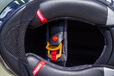A kellemes tapintású bélés természetesen kivehető, az anyaga antibakteriális. A vészhelyzet esetén kihúzható arcpárnák is sztenderdnek számítanak a kategóriában. Ez megoldás a mentők számára teszi könnyebbé a sisak eltávolítását, és csökkenti a további sérülés kockázatát. Szintén kellemes meglepetés, hogy versenysisak létére gondoltak az átbeszélőt használókra - a bélés alatt hagytak helyet az intercom hangszórójának. A dupla D-gyűrűs rögzítést az egyszerűsége miatt szeretjük, az aranyszínű bevonat tovább erősíti a prémium érzést. Kedvenc részletem a bogárháló, ami háromféle anyagból lett összeállítva. Számomra ezek a részletek mutatják igazán az átgondolt tervezést.