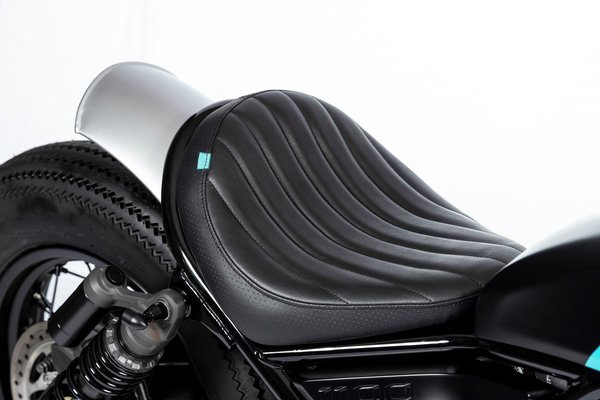 A másik gép a CMX Bobber, amelyen átalakították a villa rögzítését, így két és fél centivel lejjebb került a motor eleje. Hátul maradt a gyári futómű, a fekete, küllős kerekek ellenben egyediek, ballonos Bridgestone gumikat kaptak.