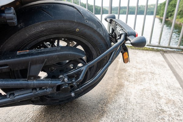 Elől határozott 160 mm széles gumik feszülnek a nyúlfarknyi sárvédő alatt bobber stílust reprezentálva a Dunlop jóvoltából. Az elég erősen flat-tracker faron pedig 180 szélesek az abroncsok. Nem szimplán a polcról levett kaucsukról beszélünk, a gumigyártót bevonták a motor fejlesztésébe. Nem véletlen például, hogy a gumi szélén H-D kereszt alakú a kopásjelző. Apró, de egyedi részlet. Két lábtartókonfig volt a bemutatón. Az előre helyezett alap konstrukció, és az alacsonyabb ridereknek vagy a még sportosabb élményre vágyóknak, a középre helyezett. Az utóbbira csak épp felpróbáltam magam, de a térdem máris ellenkezett. Végig maradtam a krúzer stílusnál. A tankot szorítani igazán se így, se úgy nem tudjuk. A jobb oldalon ugyanis a kipufogó elvezetés melegíti a belső combot. Így kicsit nehezebb kanyarról-kanyarra fűzni, de határozottan kell bánni a kormánnyal és a lábtartóval, és már borul is, ahova szeretnénk. Ha már íven van, az 1520 mm-es tengelytáv biztosítja, hogy stabilan forduljon.