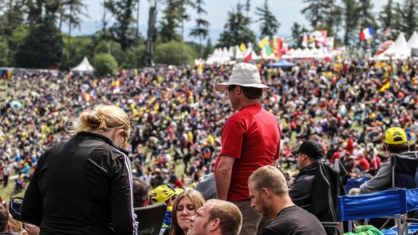 A közönség lassan felkészült a versenyekre, de tíz előtt pár perccel különös gyülekezésre lettünk figyelmesek a domboldalon, s arra, hogy mellettünk vörössé válik minden. Máig nem tudom miként, de a szervezők valahogy kitalálták, hogy összegyűjtenek pár száz Biaggi szurkolót, és odaterelik őket a Rossi-szektor mellé. Erősen irányított szervezkedésnek tűnt, és gyanítom, hogy leginkább az akkor még szerény televíziós közvetítésnek szólt, mert végül kiderült, hogy a „rajongók” összetétele elég vegyes, olasz alig, leginkább németek és csehek alkották, a piros pólókat pedig a csatlakozáskor kapták. Úgy, ahogy a görögtüzet is. Végül az egymás mellett ülő két tábort szalaggal választották el egymástól, de kijelenthetem, hogy a motorsport ultrák, akkor, 2001-ben nagyon is békés, rendszerető emberek voltak, akiknek a fejében meg sem fordult, hogy egymáshoz akár egyetlen ujjal is érjenek.
