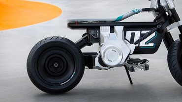 A Concept CE 02 nem is igazán robogónak tűnik, inkább afféle minimotor, talán a Honda Gromhoz áll legközelebb stílusát tekintve. Egyszerre szokatlan, futurisztikus és mókás a külseje, na meg igazán minimalista is, nem bonyolították túl. A felnik nagy teli lemezfelületűek, a lengőkar egyoldali.