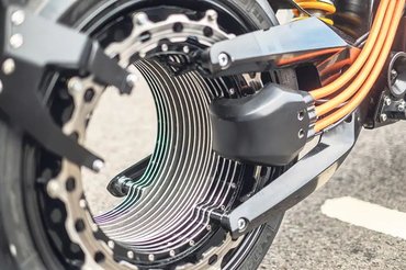 A hátsó felnit úgy alakították ki, hogy lényegében két részből áll. A belsőt a lengőkar csatolja a motorkerékpár vázához, a külső pedig forog körülötte. Ahhoz persze, hogy minden, a hajtáshoz szükséges holmi elférjen, elég széles felnire van szükség, amihez széles gumi is dukál. Cserébe viszont nincs lánc, szíj vagy kardán. A Verge TS 107 lóerős csúcsteljesítménye mellett egészen elképesztő, 1000 newtonméteres nyomaték leadására képes.
