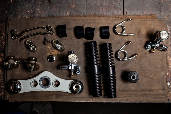 - Hát itt, nem látod!? Itt egy váz, ott egy blokk, azok meg ott a kerekek. Jelenleg az összeszerelési fázisnál járunk, a tankot még jobban át kellett formálni, szobrászat volt az egész, itt egy toldalék, ott némi varázslat, szinte újra kellett építeni. Közben kreatív megoldásokon is gondolkodnom kellett, mert egyedül a kardán volt nikkelezett, ami elég hülyén nézett ki, ezért kitaláltam, mely alkatrész legyen króm, mely fekete, és mely nikkel. A lábtartó végül jó lett, Tibit nem zavarta a légszűrő szívócsonk, biztos jól tartja a lábát. A kipufogó még kicsit melós volt, mert ha emlékszel, a szívócsonknál voltak dísz krómlemezek, amiket teljesen átdolgoztam. Ezekből hővédő lemezeket gyártottam. A kipufogó-leszorító viszont megviccelt, egy centivel akartam karcsúsítani, két esztergakés ment a kukába, mire rájöttem, hogy krómacél. Van benne anyag, furcsa. Egy napom ment rá, de legalább most vettem mindjárt két flexet, akciós volt a Lidlben.