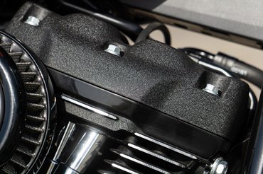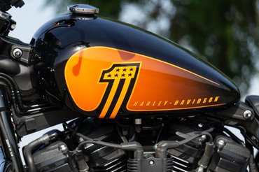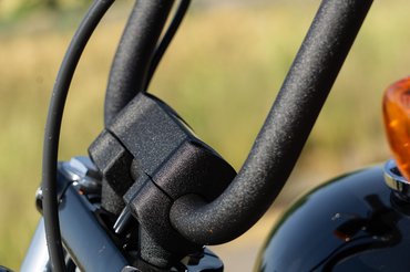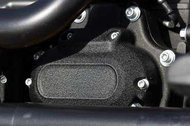 Ha már a Lowrider S szóba került, nekem azon tűnt fel először a Harley új dilije, a fémet műanyagnak álcázó felületkezelés. Ezt fejlesztették tovább, mégpedig úgy, hogy a rücskös fekete bevonatot megszórták egy adag csillogással, ami így kicsit olyan, mintha a frissen aszfaltozott útba beleszórtak volna pár marék swarovskit. Láthatóan rápörögtek, ez van a kormányon, a szelepfedeleken, a dekliken és a forgattyúsházon is. Úgy látszik, 2021-ben a matt fekete már kevés, egy bobberre pedig mégsem kerülhet króm, elvégre ez a műfaj a minimalizmusról szól, minden sallangot le kell dobni.
