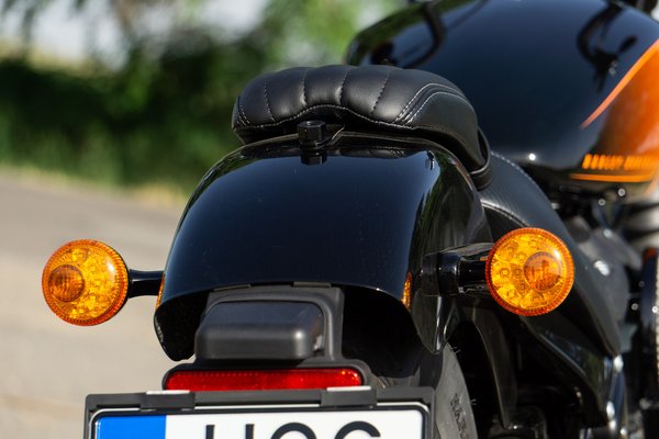 Ezért nincsenek is krómozott órák vagy hagyományos értelemben vett műszerek - van egy apró LCD kijelző a kormánybefogón, alatta pedig a visszajelzők, és ennyi, elismerésre méltó húzás a tablet méretű színes TFT-k korában. A Harley ilyesmiben nem fog hibázni, jók a rövid sárvédők, a küllős felnik, a 19-es első és a 16-os hátsó kerék a ballonos gumikkal, valószínűleg a duplacsövű shotgun kipufogóra is van magyarázat, hogy miért nem volt elég egyetlen cső - ha már mindenképpen duplázni kell valamit, szerintem az első tárcsafékkel jobban jártunk volna, mert hiába ez a legkönnyebb 114-es Harley a maga 297 kilójával, a megállást azért nem jó a szerencsére bízni. Szokás mondani, hogy cruiseren úgyis hátul van a több súly, hátsóval kell fékezni - bizonyos esetekben igaz lehet, de igazából fékezéskor a hátsó súly is előre terhel. Itt ráadásul meglenne a szükséges első tapadás a széles gumival, a hátsó fék meg amúgy is tompa, nagy lassulást attól se várj.