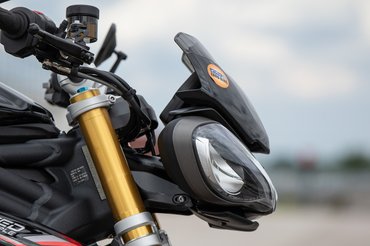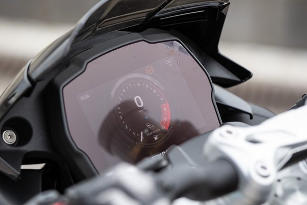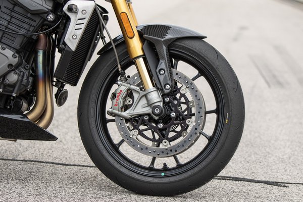 Még az autópályán tényként rögzítettem, hogy a tempomat egy csupaszon is kifejezetten hasznos dolog. A nyeregből szintén feltűnő újdonság a megvilágított kormánykapcsolók és a Street Triple-höz képest nagyobb TFT műszerfal. A menürendszer logikus, a grafika pedig kiváló, viszont indításkor idegesítően lassan bootol a rendszer. A kulcs nélküli indítás a széria felszerelés része, és tanksapka nyitásához sem kell a zsebedben turkálni. A vezetéssegédlet agya a Conti által szállított legmodernebb hat tengelyes IMU. Az ehhez csatlakozó MIB Evo kanyar-ABS különlegessége, hogy a féknyomás értékének és idejének monitorozásával képes felismerni a vészfékezést, illetve a hátsó féket képes külön körön vezérelni. Ebből a motoros általában csak annyit érzékel, hogy minden szituációban olyan stabil marad a motor, mint az oldalfekvés. Van egy Track módja is, amiben nagyobb szlipet enged, de teljesen kikapcsolni nem lehet. Természetesen a Brembo Stylema nyergekkel és állítható nyomáspontú RCS munkahengerrel operáló lassító-hardware adagolhatósága parádés.