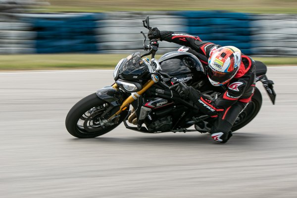 Eszméletlenül lazán lehet vele falni a kanyarokat, ha sima aszfalt van alatta. Sajnos nálunk ilyenből van kevesebb, és délután az egyik alsórendű szakaszon úgy húsz kilométer után ki kellett állnom a nyeregből, annyira lezsibbadtam az ütésektől. Valószínűleg ez az ára annak, hogy a 22-es út elnyújtott kanyarjaiban egészségtelenül nagy tempó mellett is abszolút stabil marad. Másnap az Euroringen folytatódott a móka, ahol a gyárilag pályagumikkal (Metzeler Racetec RR K3) szerelt Speedy megmutathatta valódi tudását. Ez a pálya már kissé szűkös egy ennyire erős motornak, de a könnyedsége itt is lenyűgöző. Pontos, gyors a kormányzása, mélyen a kanyarba lehet fékezni vele. Azonban már két menet után vészesen elkezdte rágni a hátsó gumit, ezért elkezdtünk kísérletezni a beállításokkal. Mivel gyári track setup sem szüntette meg a problémát, áttekertem street-be, de úgyanúgy tépett maradt a futófelület. Pedig az utolsó két menetet már Road menetmódban futottam, hogy kibírja a nap végéig.