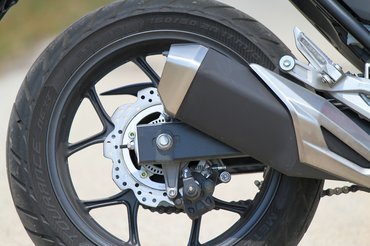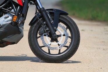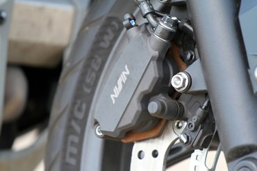 A kormány széles, a lábtartó pedig a szabad magassághoz viszonyul, de átlagos testalkattal még mindig 90 fokos szöget zár be a térd. Átszabták az idomokat, magasabb lett a plexi, rendelhető hozzá légterelő, ami a lábadról veszi le a menetszelet, de már alapfelszereltségben is elmondható róla, hogy kényelmes rajta az utazás. Inkább komfortos, mint sportos. Ez nem az a kategória, ahol arany színű villaszárral körített teljes állíthatóság kacsintgat ránk a villahidaknál. De miért is kellene. A Showa Dual Bending Valve jelzésű villák gyárilag úgy vannak hangolva, hogy közúton nem fogod zavarba hozni őket a rendelkezésre álló teljesítménnyel. Hátra azért a létminimumot jelentő előfeszítés biztosítva van, ha utassal vagy megpakolva kelnénk útra. De a magyar aszfaltminőségnél bármi durvábbal vallatva azért hamar elfogynak a tartalékai. A komfortra hangolás szinte rögtön kimeríti a rugóutat és nem okoz örömet. Nem is nagyon forszíroztam ezt a fajta felhasználást.