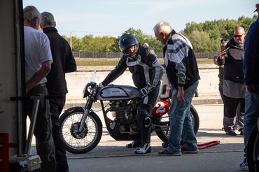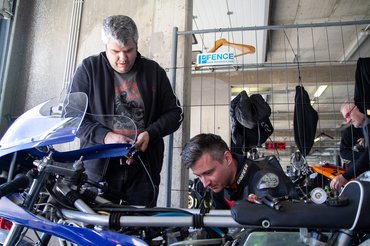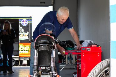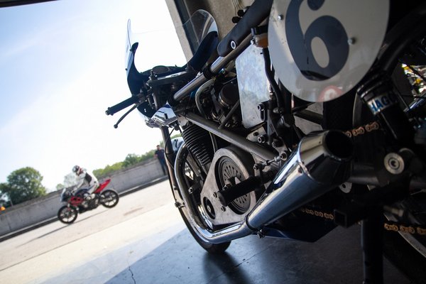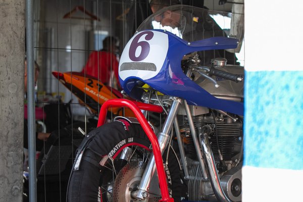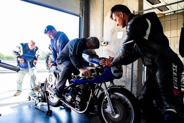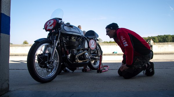 A hátunk mögött a bokszban pörgött a munka, mindenki szerelt, Tamás és Szilveszter először karbit cseréltek a Weslake-en, az idősebb Gócza pedig a Norton fékén dolgozott - közben lefutottak az edzések, az időmérők, és az előzetes várakozásokkal ellenben a Norton jó lett, a Weslake pedig nem. A karbi ugyanis jó volt, a gyújtás jeladóját kellett csak visszarakni, viszont utána köpte az olajat. Amikor a Classic kategória jött, mindig visszamentem a pályára, és vártam az angolokat, hogy elkészítsem azokat a fotókat, amikor úgy mennek velük, lapon.