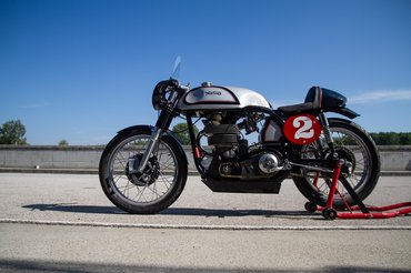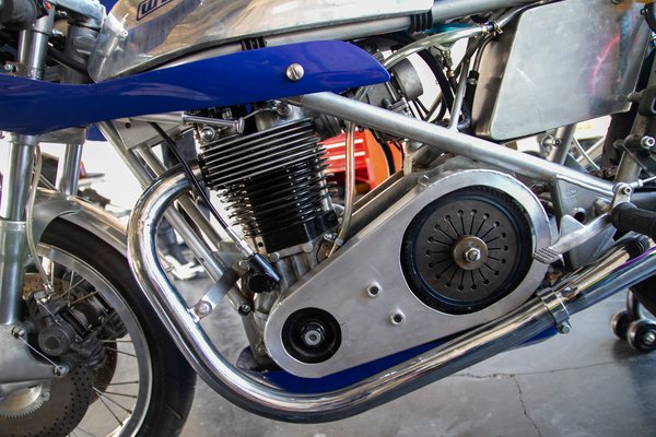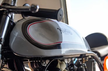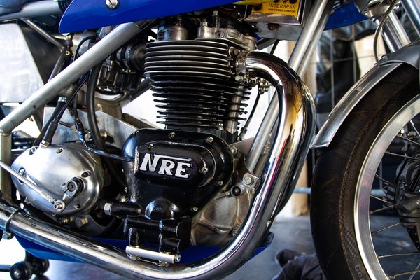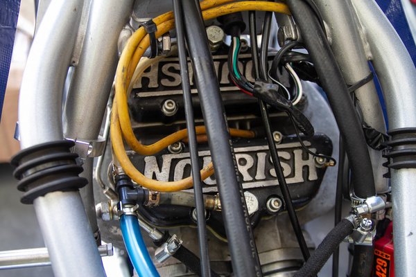 Átdolgozták a kenést, Norton olajpumpa került bele, hogy nagy fordulaton is jól működjön, átalakították a vezérlést, illetve alu hengerek kerültek fel öntöttvas persellyel. És erre jött rá koronaként a négyszelepes hengerfej, akkoriban ez még a versenymotorok kiváltsága volt, és a Weslake ebben volt a legnagyobb, a Formula-1-es tapasztalataikat felhasználva alakították ki a kis szelepszögeket és a nagyon kompakt égésteret. Ahogy a tulajdonos felhívja rá a figyelmet, ez a megoldás kompromisszumokkal jár, ugyanis eltér a szelepek elmozdulási iránya a himbák nyitási irányától, ezért a szelepvezetők egyik fele nagyobb terhelést kap, és ott bizony kopással kell számolni. Ami egy versenyblokknál apróság, nem tartósnak kell lennie, hanem erősnek: 500 köbcentivel 60 lóerőt tudott, míg az alkohollal hajtott, 950 köbcentis csúcsmodell 120 lóerőt adott - ez azért ma sem hangzik rosszul.
