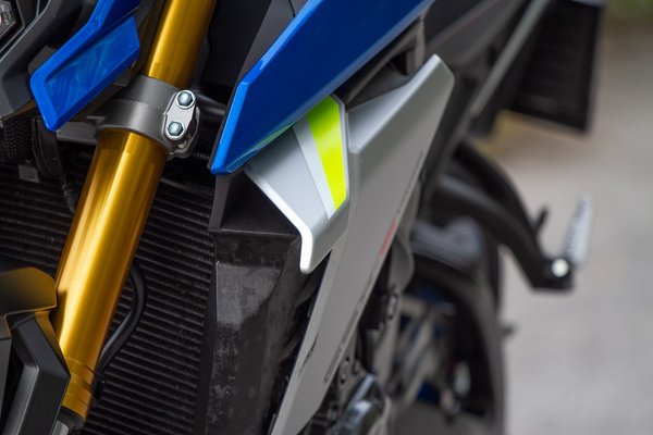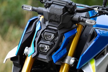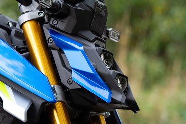 A megjelenésén nagyon látszik, hogy nem valami európai dizájnközpontban rajzolták, mint mondjuk a Honda CB1000R-t, nem is az össze-vissza futó élek zavaróak, vagy a rendkívül furcsa lámpa, hanem a teljesen indokolatlan felületek, mint például az újrahasznosított szénszálat idéző mintájú műanyag betétek - mármint ez csak az én tippem arra, hogy mire gondolt a művész, mert távolról csak simán úgy néz ki, mintha koszos lenne. A 2021-es trendeknek megfelelően erre is került már szárny, ami inkább csak utalásként működik, a funkcióját vitatnám - az ennél lényegesen nagyobb aerodinamikai elemek is leginkább 300 km/h körül hoznak érdemi leszorítóerőt, ennek fényében nemhogy naked-en, úgy általában semmilyen utcai motoron nincs hasznuk. Ezt bizonyítja, hogy a GSX-S-re raktak, a Hayabusára pedig nem.
