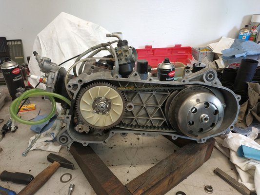 De mielőtt nagyon előreszaladnék, ott volt hajtás összerakása, aminél a tapasztalat rengeteg vacakolást spórolhat meg. Ugyanis van egy mart karter egy teli főtengellyel, egy módosított hengerrel, nagyobb karbival, hosszabb végáttétellel, más membránnal, légszűrővel, szóval nem csak annyi van, hogy valamivel felborítottuk a finom gyári egyensúlyt, hanem mindenbe, egyszerre nyúltunk bele.
