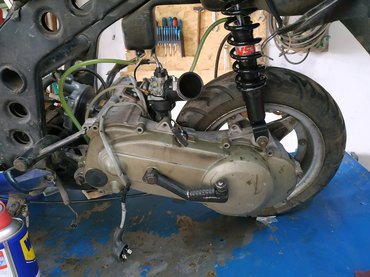 Helyére került a hajtás, a hosszabb végáttétellel, az új fékpofa, illetve Gábor csodapolcáról néhány eredeti olajcső is belemászott a robogómba. A tanácsait megfogadva kidobtuk az automata szivatót, és kézit építettünk be - természetesen volt vele szívás, mert kínai szar, de a már sokat emlegetett polcról előkerültek a megoldást jelentő eredeti alkatrészek.