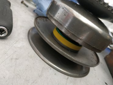 A Piaggio RP1 blokkba viszont nem megy csak úgy bele az RP3-as blokk kuplungja, egyfelől faragni kell a hajtásházon, hogy legyen helye a nagyobb hátsó tárcsának (csodás volt látni, ahogy Gábor rámegy a Dremellel a karterre - a TB24-en ugyanezért úgy vágná ki a motort, mint macskát szarni), illetve szükség van egy kis közdarabra a kuplung alá. Ez utóbbit lecsapatta az aranykezű Bécivel, és mire mentem, már ott várt az asztalon. Ahhoz, hogy a leszorító anya se érjen bele a deklibe, arról is Béla gondoskodott, szépen lekapott mind a két oldalából. A kuplunggal nem volt sok gondunk - egy erősebb kontrasztrugó került bele, illetve a rugó alá egy Malossi rugótányér, aztán a helyére is került.