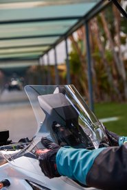 A szélvédő nekem egyébként leginkább a felső állásban adta ki, alacsonyabban sem volt borzasztó, de az a tény, hogy menet közben nem állítható, elvette a kedvem a kísérletezéstől. Mert hiába az öt fokozat és a 16,4 centi az alsó és a felső állás között, ha ehhez le kell szállni a motorról, megette a fene az egészet. Egy túrán folyton megállni, csak azért, mert kiértél a faluból, ráfordultál az autópályára, vagy éppen kisütött a nap? Lefelé lökdösni még úgy-ahogy lehet menet közben, de visszahúzni már nem sikerült, két kézzel sem - leszállva sem könnyed mutatvány, ennél jellemzően jobb megoldásokkal találkoztam csak az elmúlt években. Sokkal cikibb a helyzet annál, hogy a BMW, a Ducati vagy az MV Agusta megoldásait lobogtassam, hiszen a Honda a Forza 125-ös robogóhoz is alapáron adja az elektromos szélvédőállítást, az NT1100-hoz pedig még felárért sincs. Állítólag azért, mert vagy a formatervnek vert volna alá, vagy az ára nem fért volna bele az ötmillióba - értem, de még egyszer: a Forza 125-ben is megoldották.