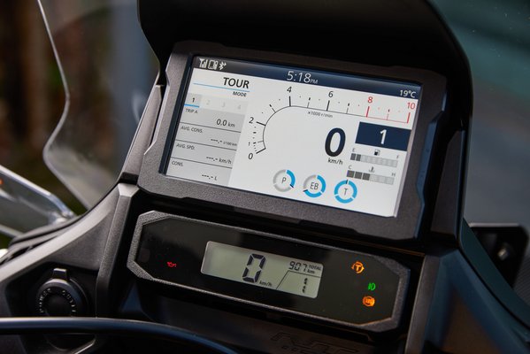 A műszerfal és a kezelőszervek az Africa Twinről jöttek, ugyanaz a nagyméretű, jó felbontású, szép grafikájú, de furcsa logikájú rendszer, három előre programozott üzemmóddal (Tour, Urban, Rain) és két szabadon konfigurálhatóval, amelyekben külön-külön állítható az erőleadás, a kipörgésgátló érzékenysége, a motorfék és a DCT karaktere is.