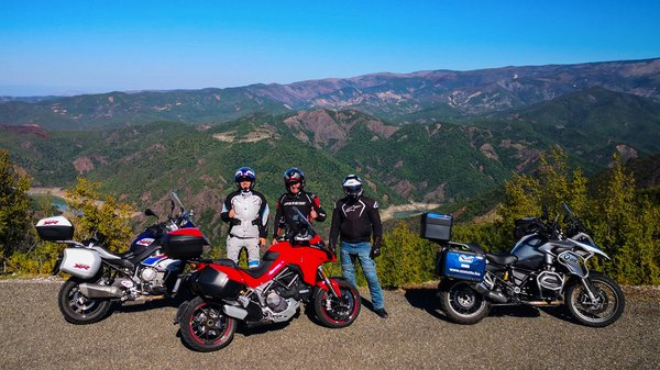 A szokásos kettő helyett három csoportra osztva indultunk el Sarandából, amiket – tekintettel a BMW-s többségre – a különböző menetprogramokról neveztünk el. Volt egy„Dynamic” csapat, egy„Road”, és egy másnaposokból és óvatos duhajokból álló „Rain”. Én a középsőt vezettem fel. Az albán riviérán futó SH8-as út 80 km-e a világ egyik legjobb motoros útja. Végtelenszámú kanyarral vezet végig a tenger partján, mesebeli beach-ek, hatalmas sziklák és apró falvak között. Az út a Llogara nemzeti parknál hirtelen 1000 méter magasba visz fel, közben ötször oda-vissza mész a hegy oldalán, egyik irányban a tenger, a másikban egy 2000 méter magas hegycsúcs adja a hátteret.