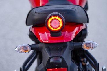 A fordított teleszkóp is fokozza a menőségi faktort, de az olyan apróságok, mint a sárvédő fémkonzolja, vagy a lámpa felfogatása is sugározza az igényességet. Az egyik kedvenc részletem a vaskos vázon lévő két kis dobozka, amik kábelezést és gyújtótrafót rejtenek. A másik pedig, hogy alaphelyzetben a lengővilla felső vonala párhuzamos a hátsó lábtartó alsó tartórúdjával. Mindjárt abbahagyom az ömlengést, csak annyit súgok még csendben: hátsó lámpa. Mennyire jól néz már ki!