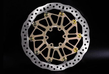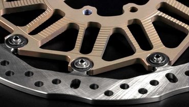 A Floatech féktárcsa lényege, hogy a többi úszó tárcsához hasonlóan két részből áll, van a felfogatás, amely egy eloxált elem, ezt rögzítik a kerékhez, és van a súrlódó rész, amelyre a fékbetét ráharap, a kettőt pedig csapok fogják össze. A kettő anyaga eltérő, különböző tulajdonságokkal rendelkeznek, és a hőtágulásuk is más. A Galfer az ebből fakadó problémák kimozgására kitalálta, hogy a kettő összekötését titán csapokkal és rugós alátétekkel oldják meg - a csap rögzít, a rugós alátét pedig ráfeszíti a tartórészre a rotort, hogy az folyamatosan ugyanabban a pozícióban legyen, hőtágulástól függetlenül.