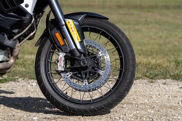 A BMW valamiért nem ment el az extremitás irányába, beérték 305 mm-es első tárcsával és egy nagy, 276 mm-es hátsóval - elöl két darab négydugattyús nyereggel, hátul egyetlen kétdugattyússal. A Mutlistrada V4 S-re ezzel szemben előre brutális méretű, 330 mm-es tárcsák kerültek a jelenleg a csúcsot jelentő Brembo Stylema nyergekkel. A Ducati féktávon nem kérdez, olyan szigorúan áll meg, mint egy sportmotor. Nem véletlenül, a jobbakon ugyanilyen Stylema nyergek vannak. A BMW nagyobb hátsó féke (a Ducatin 265-ös tárcsa van hátul) terepen hasznos, amikor sokat használod, később melegszik el, mint egy kisebb, illetve talán jobban adagolható, legalábbis elméletben, mert a valóságban mindebből semmit nem éreztem.