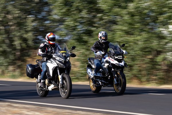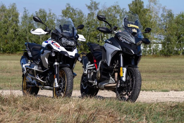 Az R 1250 GS-t ezzel szemben csakis ESA-val szabad megvenni. Függetlenül attól, hogy bejön-e a Telelever felfüggesztés, a GS az elektromos futóművel az igazi - olyan, mint autóban a klíma, az emberiség sokáig megvolt nélküle, de a hiánya hatalmas visszalépés. A GS futóműve hosszabb, míg a Ducati elöl 170, hátul 180 mm rugóúttal gazdálkodik, addig a BMW-n 190 és 200 mm áll a rendelkezésedre. Már egy alig göröngyös földúton is kiderül, hogy terepen a GS a jobb. Nem kategóriákkal, éppen csak egy árnyalatnyit, éppen annyival ügyesebb, amennyivel a Multistrada jobb aszfalton. Ugyanis a Ducati kanyarban, pláne, ha jó az út, talán még precízebben irányítható. Amiben viszont egyértelműen odaver, az a fék.