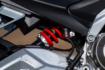 Bár anno az RS koncepció változatán a felső polcos Brembo M50 nyergek voltak, a fekete M32-esekkel is meg lehet állni. Természetesen a felső munkahenger is radiális, a fékérzetre és a fékhatásra sem lehet panasz. Egyedül a futómű nem üti meg azt a szintet, amit a vételár tekintetében elvárható lenne. Az első teleszkóp egyszerűsítését már említettem, de a rövid országúti és kispályás menet alatt nem tűnt különösebben alul csillapítottnak, erős fékezésnél sem esett össze az eleje. A hátsó gátló szintén elég egyszerű darab, és némileg sprőden is működik. Tudhatták ezt a gyárban is nagyon jól, ezért a 2022-es modellévre bedobták a Factory változatot, ami az összes említett hiányosságot pótolja: alapból benne van az IMU és a gyorsváltó, kapott egy szemre igen komoly Sachs rugóstagot, és az elején is minden paraméter állítható. Ráadásul rádobták még a plusz öt lóerőt, rövidebb lett a végáttétel és az üléstakaróért sem kell külön fizetni.
