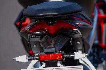 A Tuono első ránézésre egy olyan RS 660, ami éppen vetkőzik. Erős is lenne csupasznak hívni, mert szinte mindenhol van rajta idom. És ez egyáltalán nem baj, mert így némi szélvédelem is társul a nagyobb növésűek számára is megfelelő ergonómiához. De a formákból és a színválasztékból is sejthető, hogy ez a motor nem a klasszikus naked bike-ok közönségét próbálja megnyerni. Végre egy harsány és ízig vérig modern cucc, ami a huszonéveseknek szól – és nem csak a negyvenesek tudják kifizetni. Pedig drágának tűnik a puccos menetfénnyel az elején, ami egyúttal indexként is funkcionál. Végre nem kell kiálló és sérülékeny bizbaszokat nézegetni a motor oldalán, hát nem csodálatos? Az RSV-t idéző tömzsi kis farokidom a hegyes hátsó lámpával pedig szintén dizájn-műremek. Optikai szempontból a gyári üléstakaró kötelező extra, a hátsó lábtartókonzol eltávolítása pedig erősen ajánlott. De még a hasidomból sem spórolták el a munkaórát, ami kerek egészet alkot az igencsak kellemes hangot produkáló kipufogó dobbal.