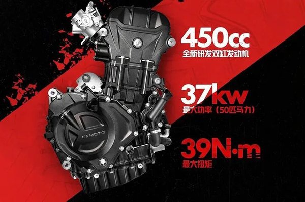 A 450 köbcentis soros kéthengeres kereken 50 lóerőt tud, legnagyobb nyomatéka 39 newtonméter, minderre pedig 168 kilogramm jut menetkész állapotban. Új fejlesztésű blokkról van szó, amely könnyebb és kompaktabb, mint a kínai gyártó többi, hasonló lökettérfogatú gépe, és karaktere is teljesen más.