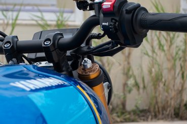 De már a kiegészítőként elérhető kis lámpaidom is sokat dob a megjelenésen, mert eltünteti a műszerfal és a lámpa közötti űrt. Egyébként maga a gyár is ösztönzi a vásárlókat az átalakításokra, egészen gazdag pimpelős kínálatból lehet válogatni. Sőt! A Yard Built program keretében elindult egy közös projekt a Cafe Racers of Instagrammal, amelynek végeredményét az őszi EICMA-n láthatjuk majd. Bár nem sok fényezett idom van a motoron, azok viszont kifejezetten igényesen lettek kigondolva. A piackutatások szerint a szín kulcsfontosságú tényező ebben a kategóriában. Jelen esetben a nyolcvanas évek versenymotorjaihoz nyúltak vissza inspirációként, Christian Sarron legendás RD 500-as versenygépének színeit keverték ki az XSR-hez. Meg van egy fekete variáns is azoknak, akik nem elég vagányak ahhoz, hogy színes motorra üljenek – vagy jó esetben azonnal saját ízlésükre fényeztetik. A kékkel engem megvettek kilóra, pláne, hogy a Spin Forged eljárással öntött felnik meg aranyszínben pompáznak. Így nemcsak jól néznek ki, hanem a főleg a külső részen megspórolt súly miatt a rugózatlan tömeg mellett hatásosan csökkentik a giroszkóp hatást is.